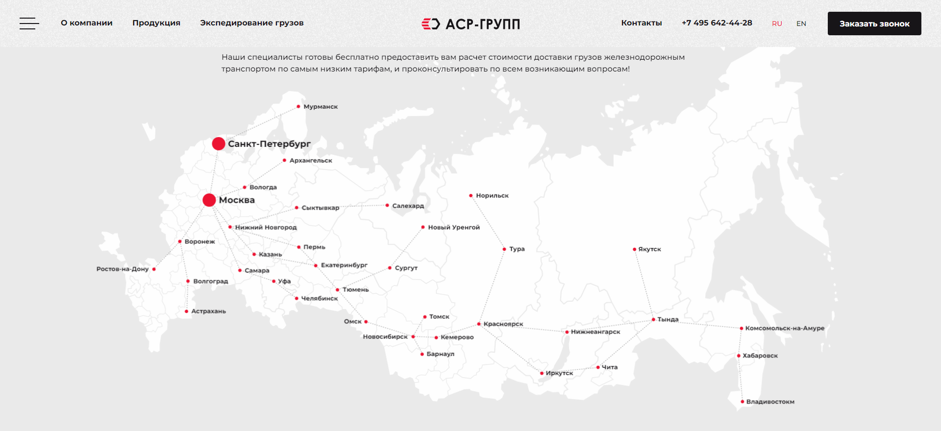 Дизайн – простота, лаконичность, технологичность. Анимированные блоки с цифрами и фактами о компании, карта с указанием городов, в которых работает компания, и маршрутами, фотографии по тематике в одном цветовой решении, графики, бегущая дорожка текста не отвлекают от содержимого сайта, а грамотно дополняют содержимое. Сайт выполнен в двух вариациях – на русском и английском языках. Размещены формы обратной связи.