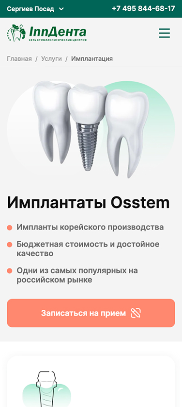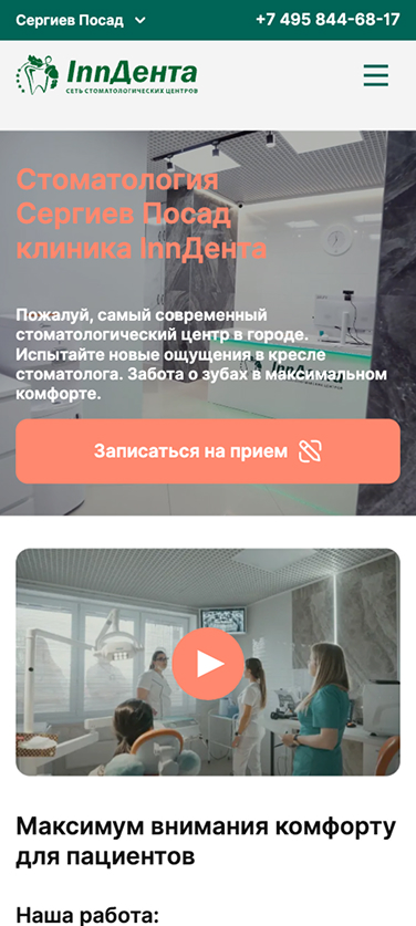Создание сайта для сети стоматологий — задача, требующая баланса между функциональностью, эстетикой и маркетинговой эффективностью. Inndenta.ru — это полноценный инструмент привлечения пациентов, который разработан на платформе 1С-Bitrix. Сайт стоматологии должен вызывать доверие, но при этом не выглядеть шаблонно, поэтому нами был разработан уникальный дизайн, который соответствует бренду. Цветовая гамма, шрифты, иконки — всё работает на узнаваемость. Более 60% трафика идет с мобильных, поэтому верстка отзывчивая, а интерфейс интуитивен даже на маленьких экранах.