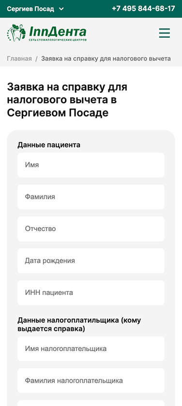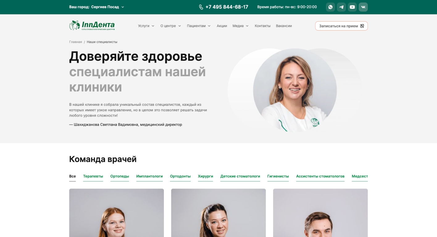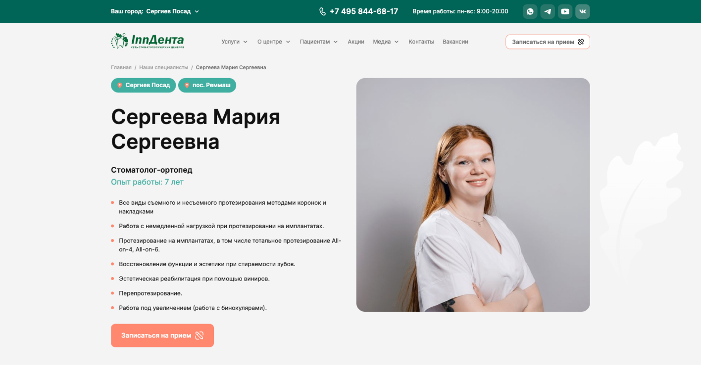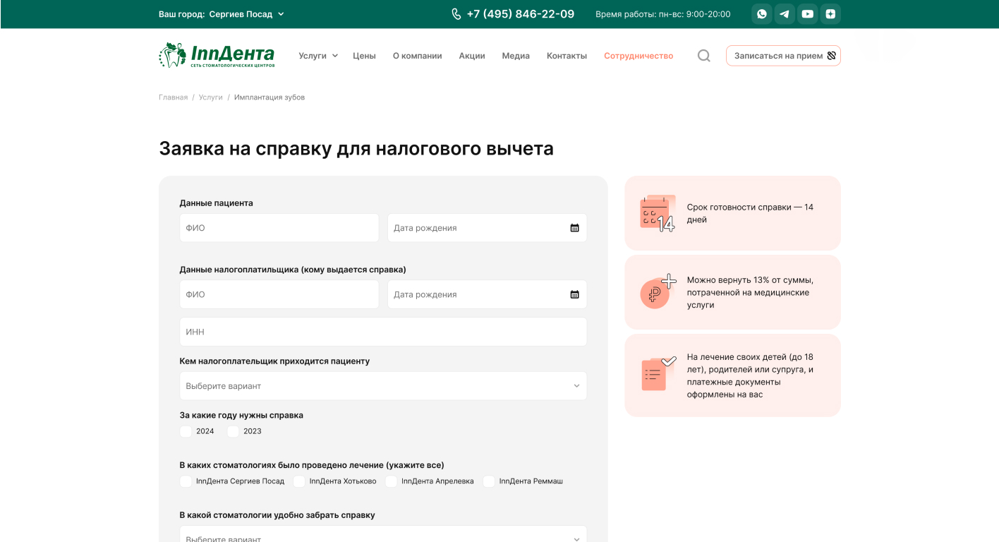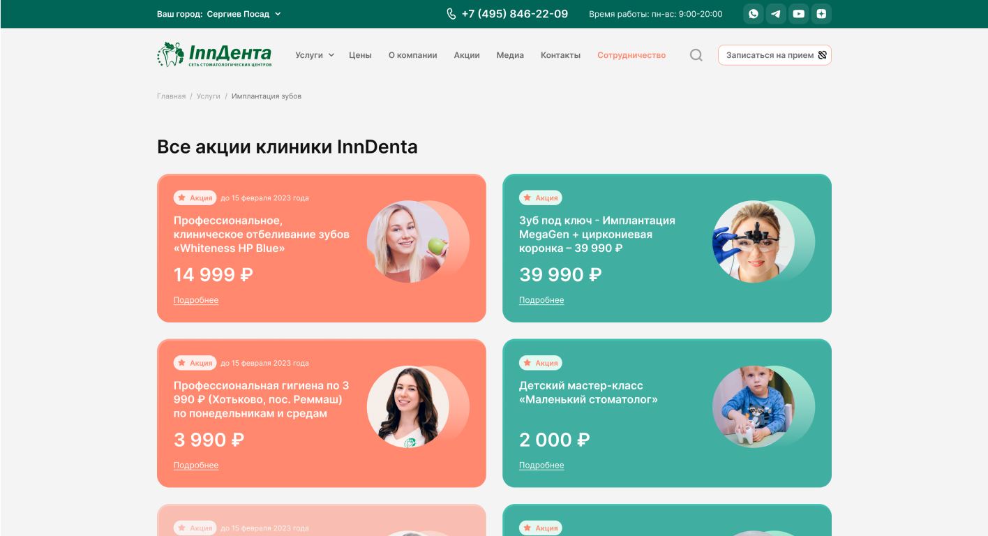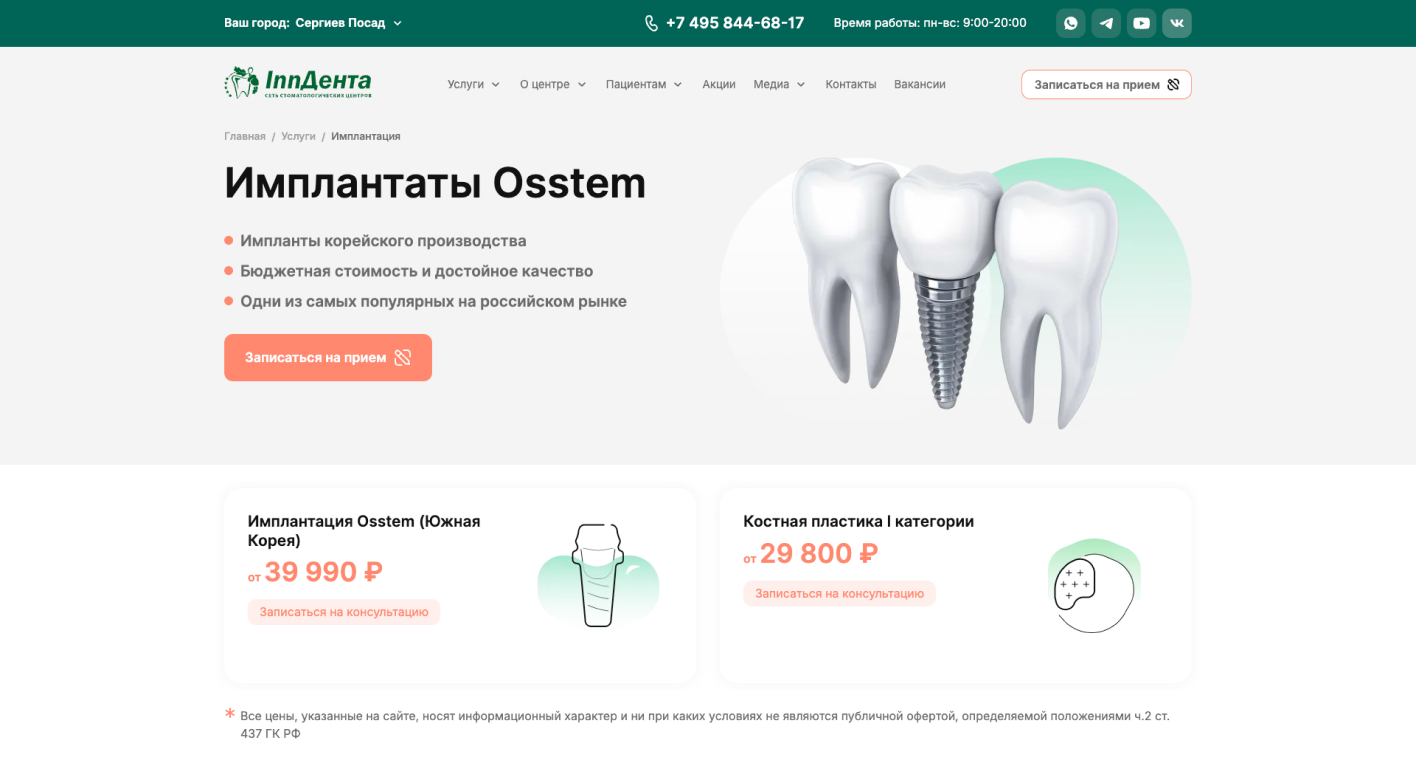 Клиника Innдента представлена в нескольких городах, и важно было избежать дублей контента, но при этом давать пользователю релевантную информацию. Контент автоматически подстраивается под выбранный город (цены, адреса, контакты, врачи). Для каждого региона — свои метатеги, УРЛы, что помогает в локальном продвижении клиник. Сайт стоматологической клиники отвечает требованиям постановления Правительства РФ от 04.10.2012 №1006.