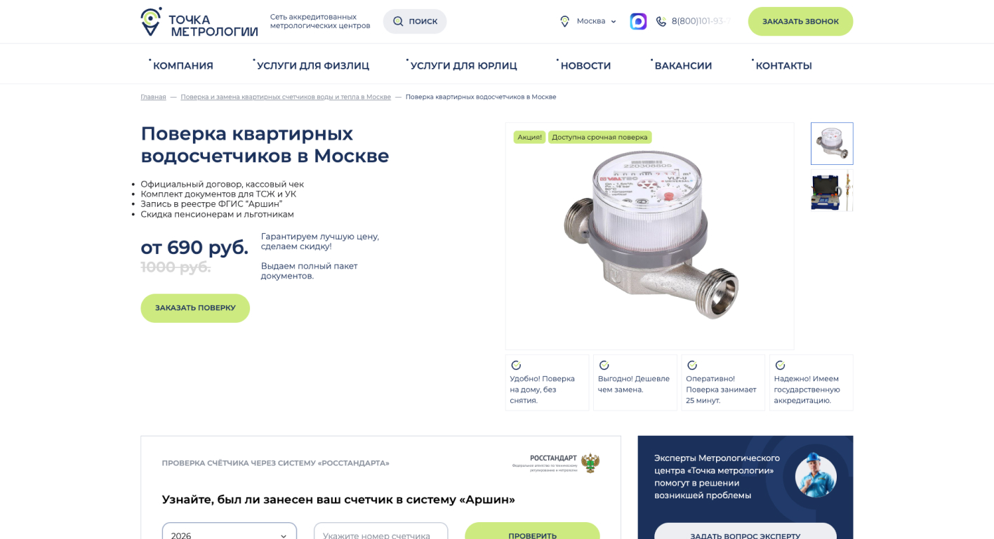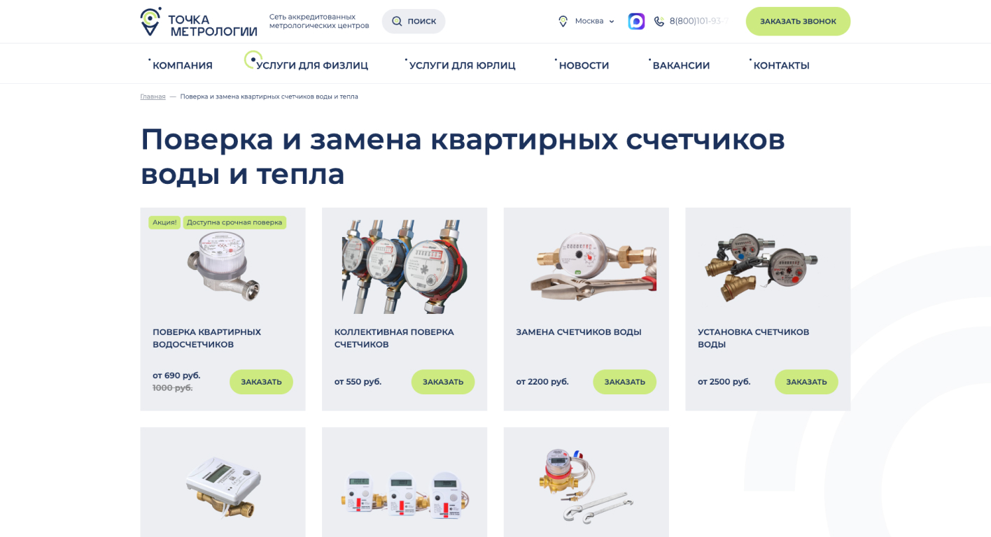 В рамках проекта был разработан корпоративный сайт для сети аккредитованных метрологических центров с учетом масштабируемости и региональной специфики. Дизайн создан с нуля — с акцентом на доверие, структурированную подачу услуг и удобную навигацию для разных категорий пользователей. Реализован функционал региональности, охватывающий 6 городов и более 800 населенных пунктов: для каждого региона настроено автоматическое размножение страниц с уникальным контентом и маршрутизацией заявок на соответствующие электронные адреса. На сайте предусмотрены два отдельных каталога услуг — для физических и юридических лиц, что позволяет четко сегментировать предложения и упростить путь пользователя. Дополнительно настроены инфоблоки с новостями и вакансиями для оперативного обновления информации и поддержки HR-направления.